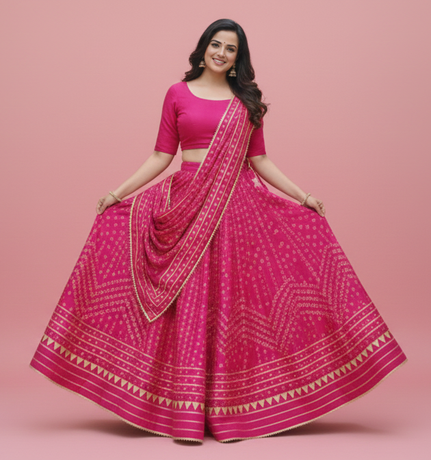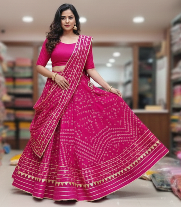Add a royal touch to your ethnic wardrobe with this stunning Rani Pink Bandhani Print Lehenga Choli Set, crafted to reflect traditional elegance with a vibrant festive appeal. The lehenga features classic Bandhani-inspired motifs spread beautifully across the flare, enhanced with a striking gota patti and geometric border that adds richness and movement to the outfit.