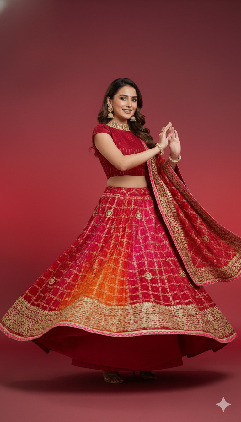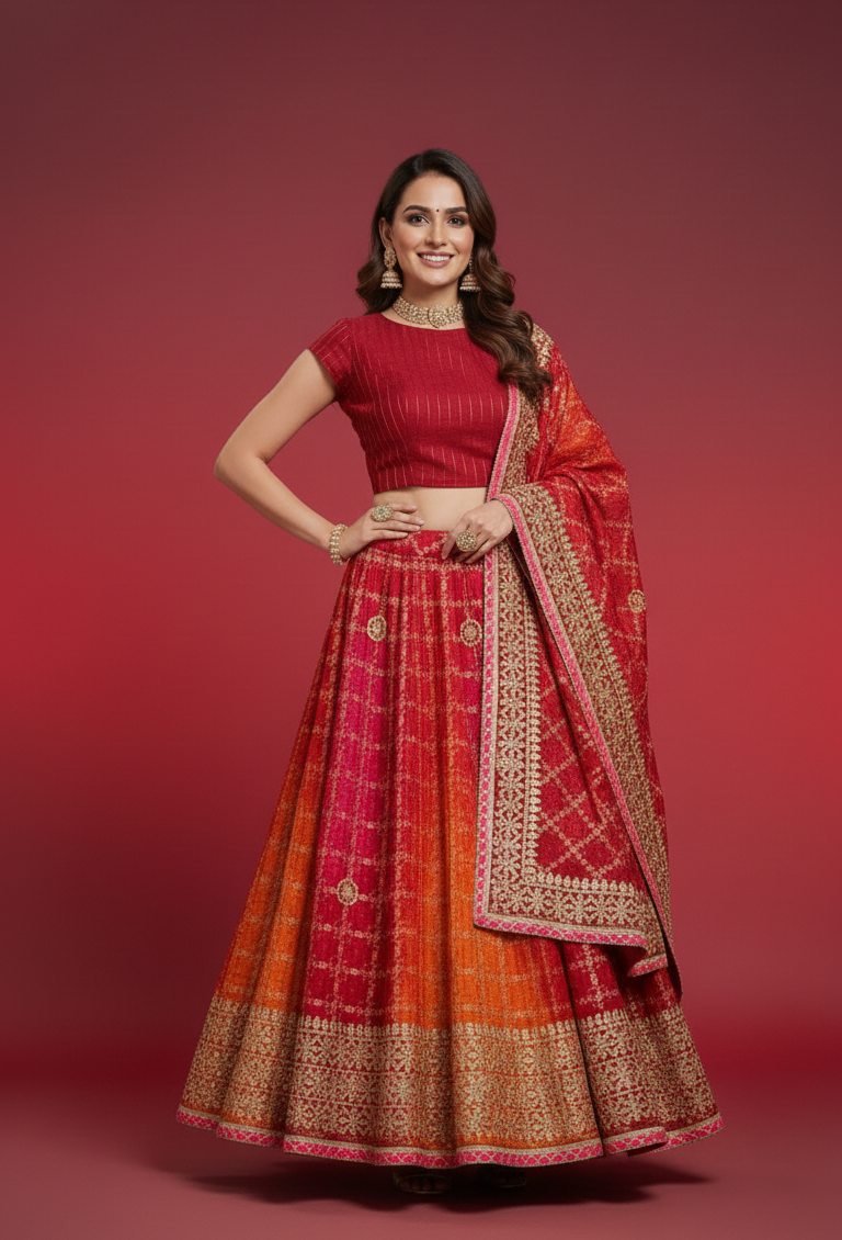 Make a graceful statement with this elegant Red–Orange Banarasi Style Lehenga Choli Set, designed to bring out traditional charm with a luxurious touch. The lehenga features a beautiful dual-tone red and orange base adorned with intricate golden zari woven motifs arranged in a classic grid pattern, giving it a regal Banarasi look.