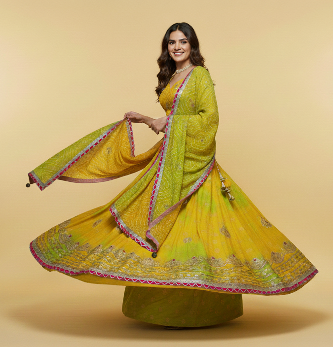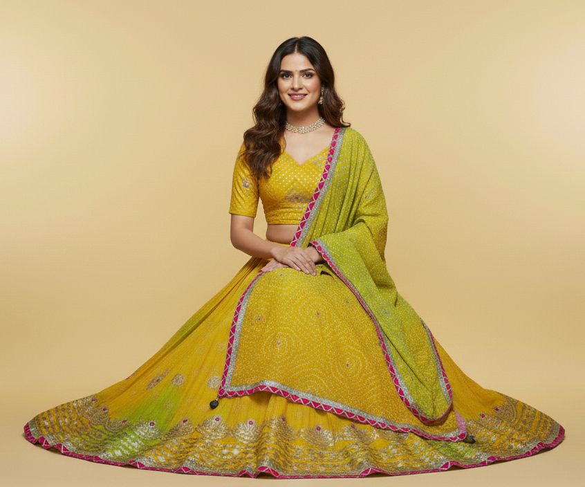 Enhance your ethnic style with this beautiful Yellow–Green Dual Tone Bandhani Lehenga Choli Set, crafted with a refreshing color blend and traditional detailing. The lehenga features elegant bandhani-inspired motifs highlighted with mirror work accents and a striking heavy gota patti border, giving it a rich and graceful festive appeal.