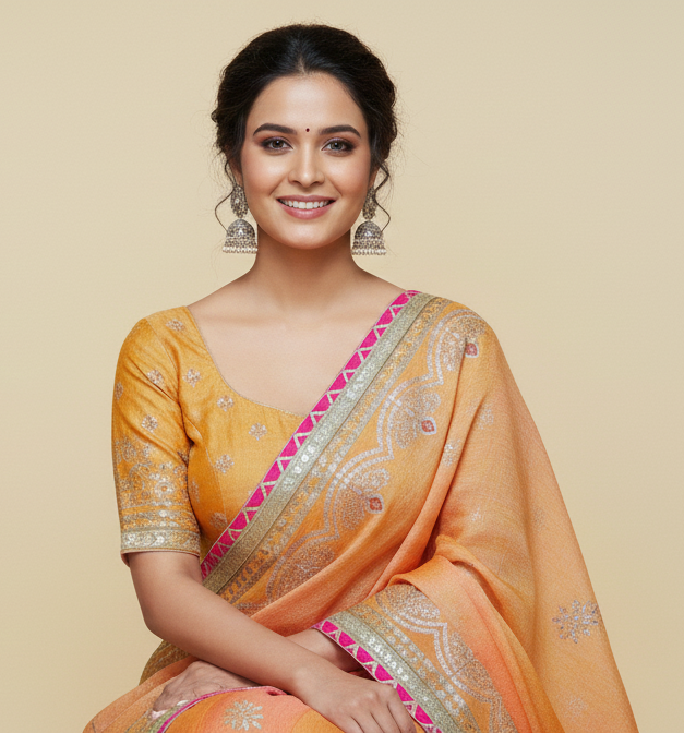 Grace your ethnic wardrobe with this beautiful Peach–Orange Dual Tone Bandhani Lehenga Choli Set, crafted to offer a perfect balance of softness and traditional elegance. The lehenga is adorned with delicate bandhani-style motifs, enhanced with subtle mirror work detailing and finished with a classy gota patti border that adds festive charm without being overpowering.