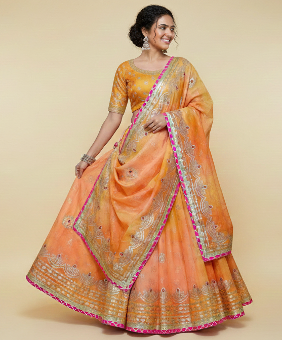 The warm peach and orange hues create a soothing yet vibrant look, making this lehenga an excellent choice for haldi ceremonies, festive gatherings, Navratri, Garba nights, and wedding functions. Lightweight and comfortable, this lehenga set comes with a matching blouse and dupatta, ensuring effortless style throughout the celebration.
