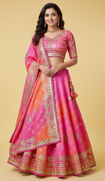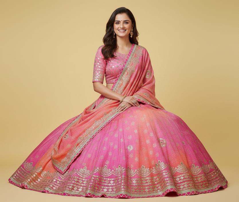 The soothing blend of pink and peach tones gives this lehenga a classy, feminine appeal, making it perfect for weddings, festive celebrations, Navratri, Garba nights, and special occasions. Paired with a matching blouse and dupatta, this lehenga offers both comfort and sophistication, ideal for long festive wear.